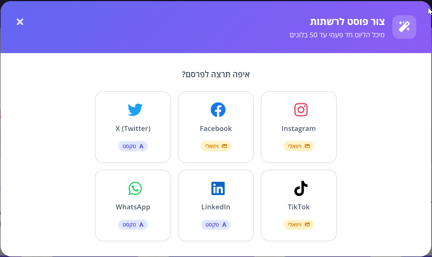 - התאמה לפלטפורמה: בחר היכן תרצה לפרסם: Instagram, Facebook, X, TikTok, LinkedIn או WhatsApp. ה-AI יתאים את אורך הטקסט, סגנון הדיבור וההאשטאגים הנכונים.