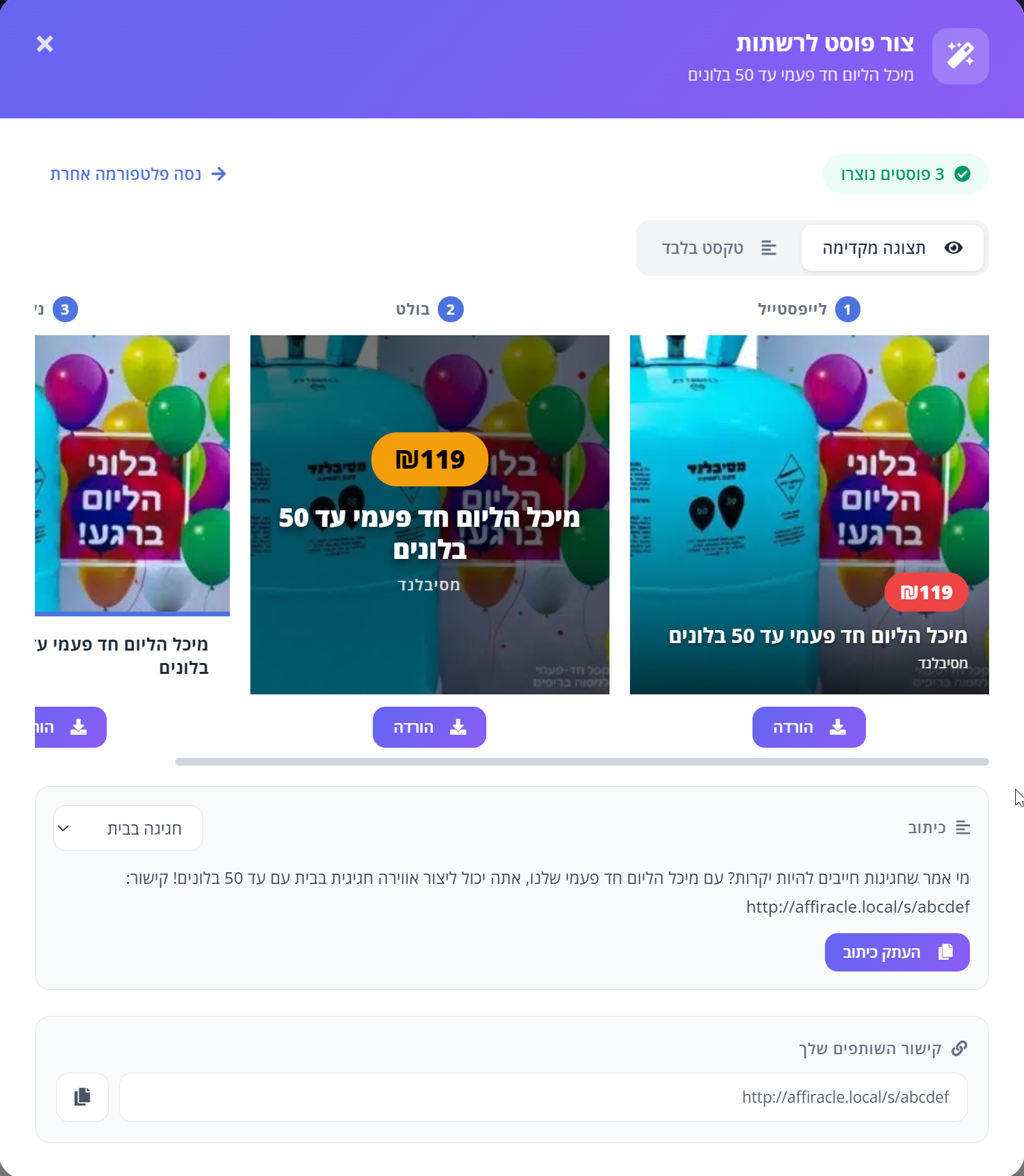 הפוך מוצרים לעמלות בקליק אחד. הפיצ'ר החדש של אפירקל רותם את עוצמת הבינה המלאכותית כדי לייצר עבורך תוכן שיווקי מושחז, מעוצב ומוכן לפרסום – עם קישור השותפים האישי שלך כבר בפנים.